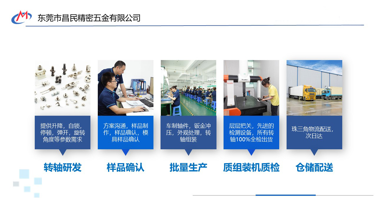 昌民精密注是东莞一家研发、生产各类笔记本电脑转轴、DV转轴、LCD转轴、电话转轴、手机平板转轴、台灯转轴、学习机器转轴、医疗设备转轴、一体机转轴、精密数控车削件、冲压件等五金产品的转轴生产厂家。昌民的转轴产品已广泛应用于笔记本电脑、平板手机皮套、汽车、台灯照明、无人机、收音机、耳机、医疗、户外设备、军工等各个领域。公司已通过ISO9001:2015质量认证体系,以合理化、标准化、系统化、自动化为标准作业,为客户提供优秀的产品和良好的服务。如果您有转轴定制的需求,以上是昌民的定制流程。